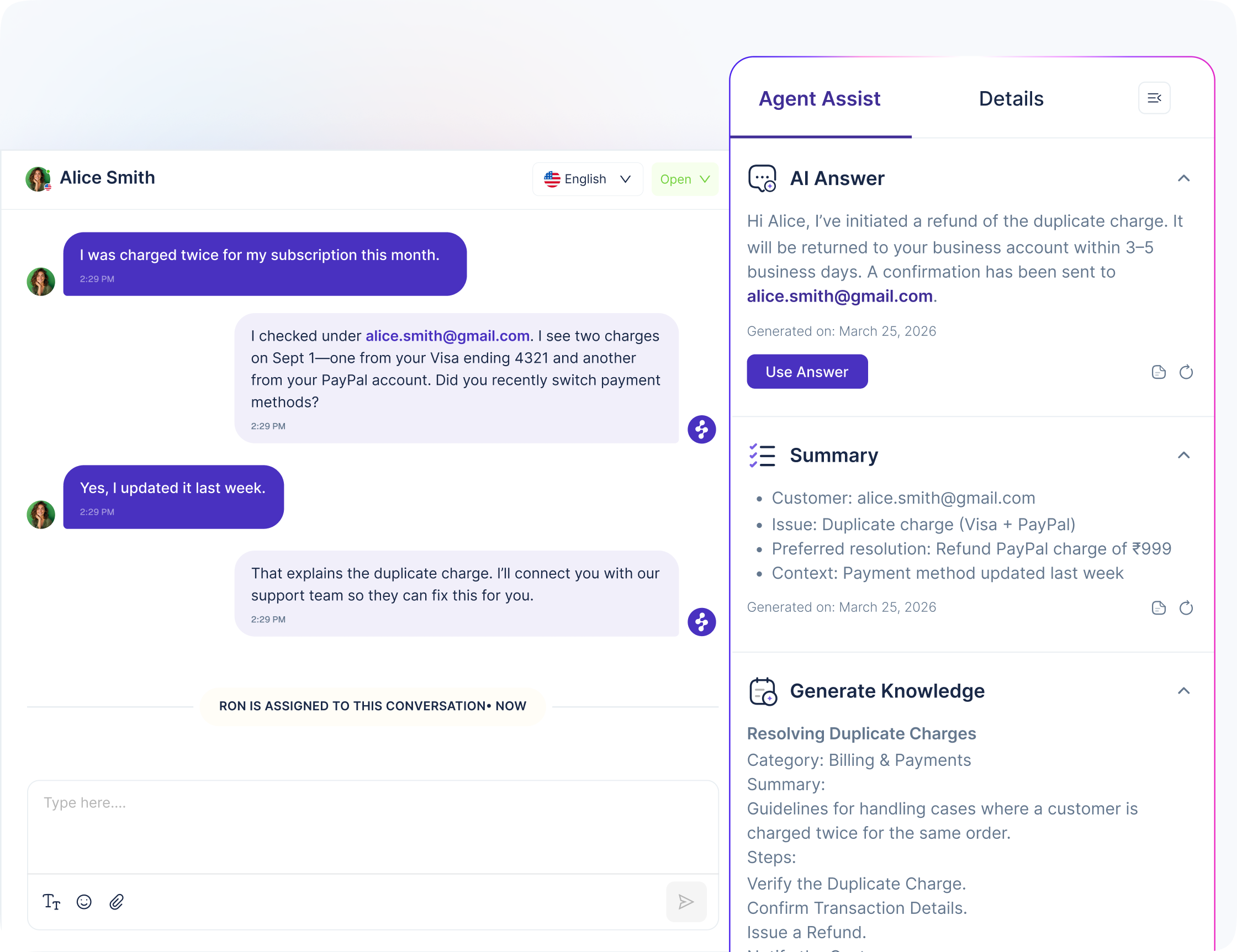 Embeds inside Salesforce, Zendesk, Jira, and ServiceNow - summaries, replies, and knowledge on live tickets.