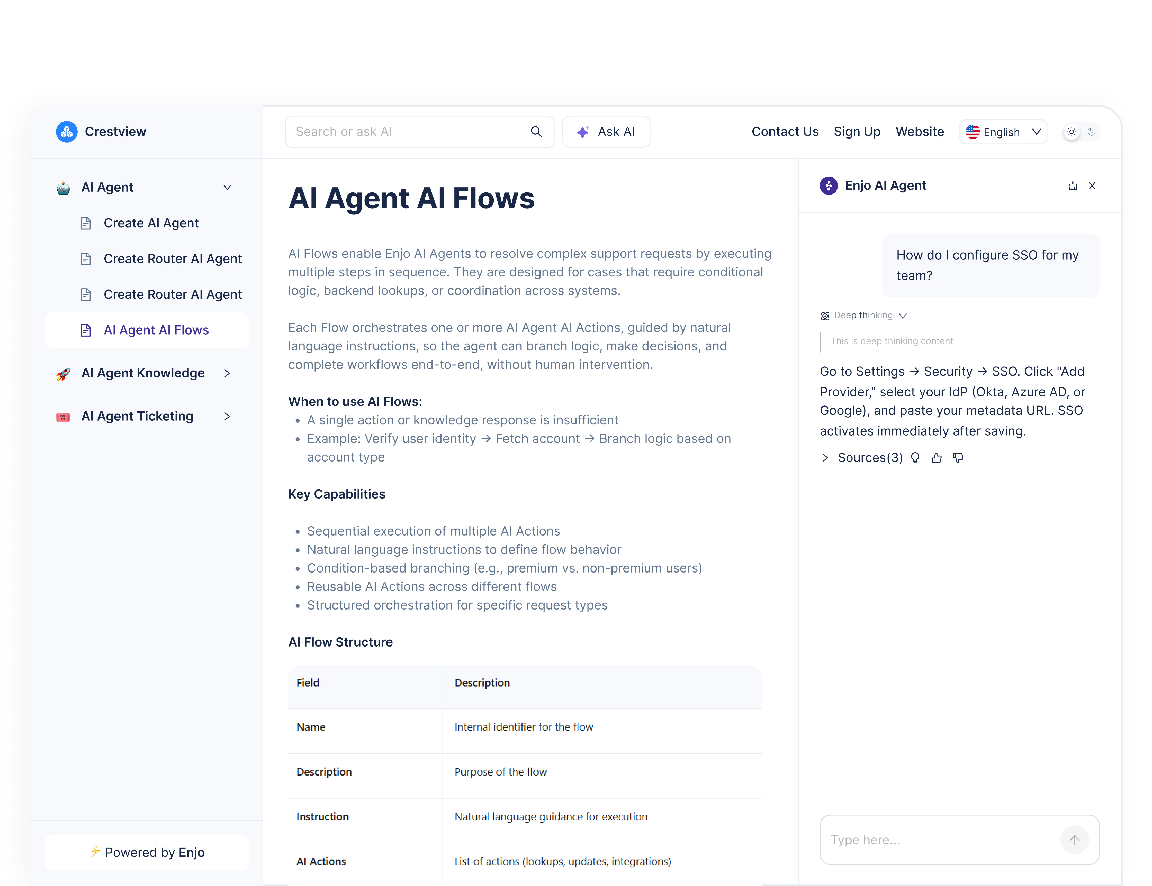 AI Agents resolve repetitive requests. Your team handles the exceptions with full context. Enjo adds AI resolution to the tools your team already uses - or works standalone.