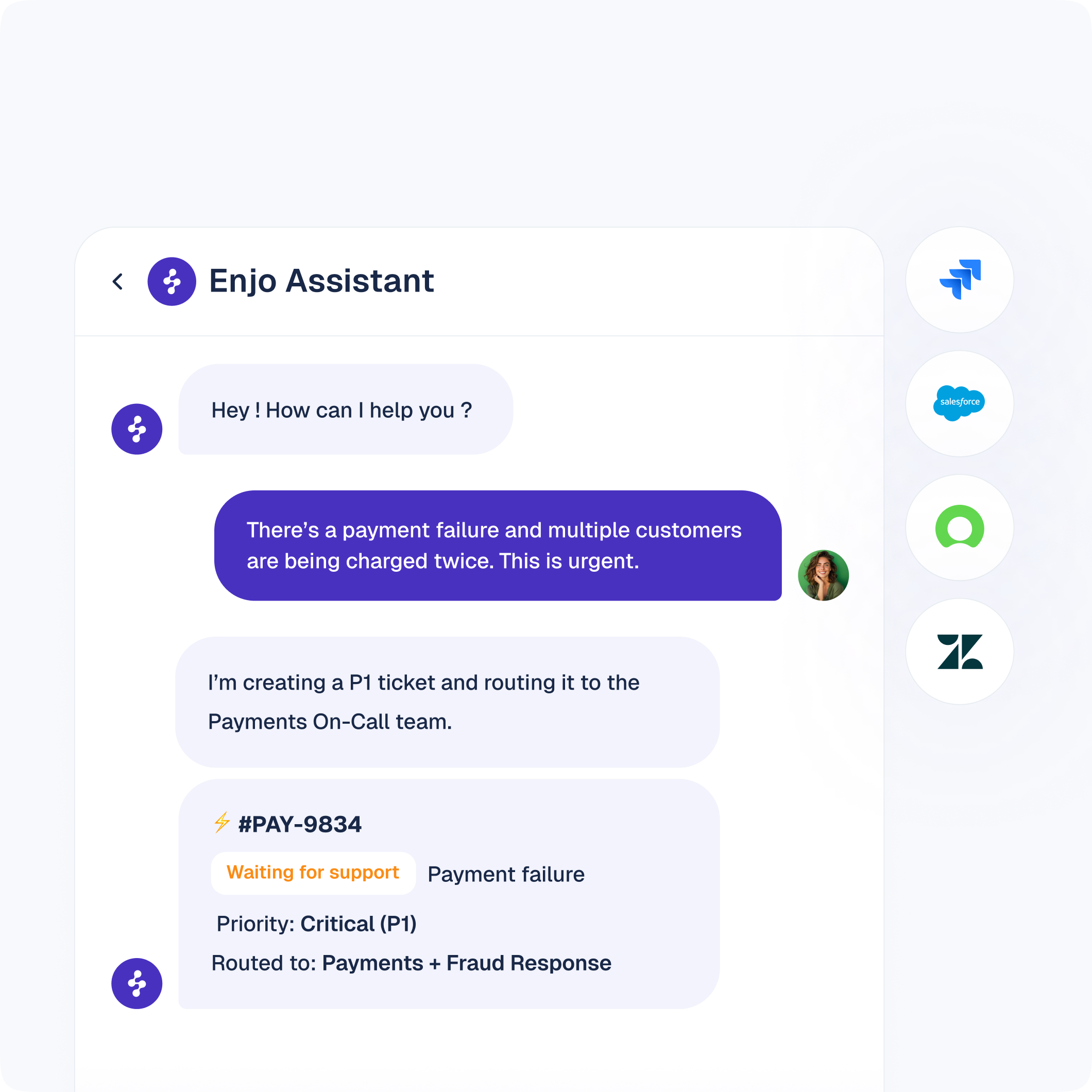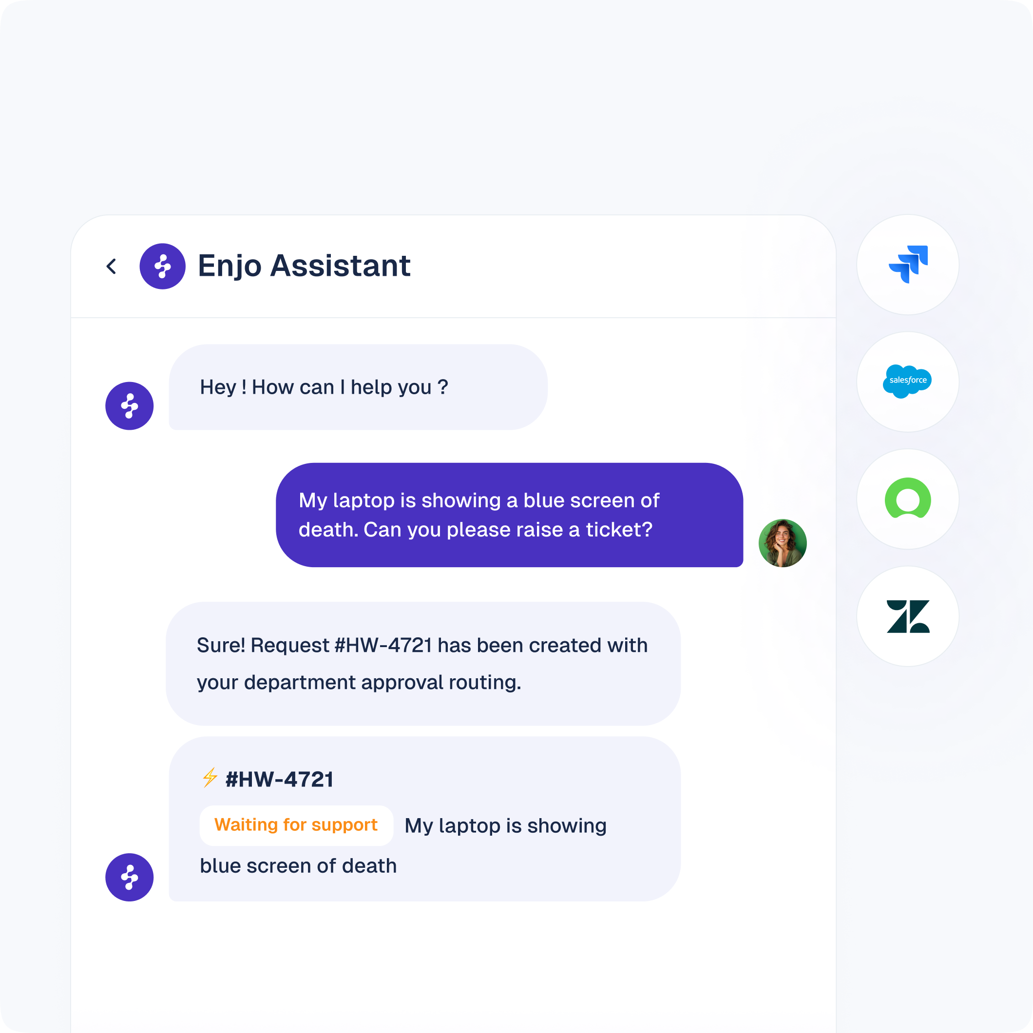Enjo detects issue type, assigns priority, and creates tickets directly in Jira, Salesforce, or Zendesk, then routes them to the right teams or channels.