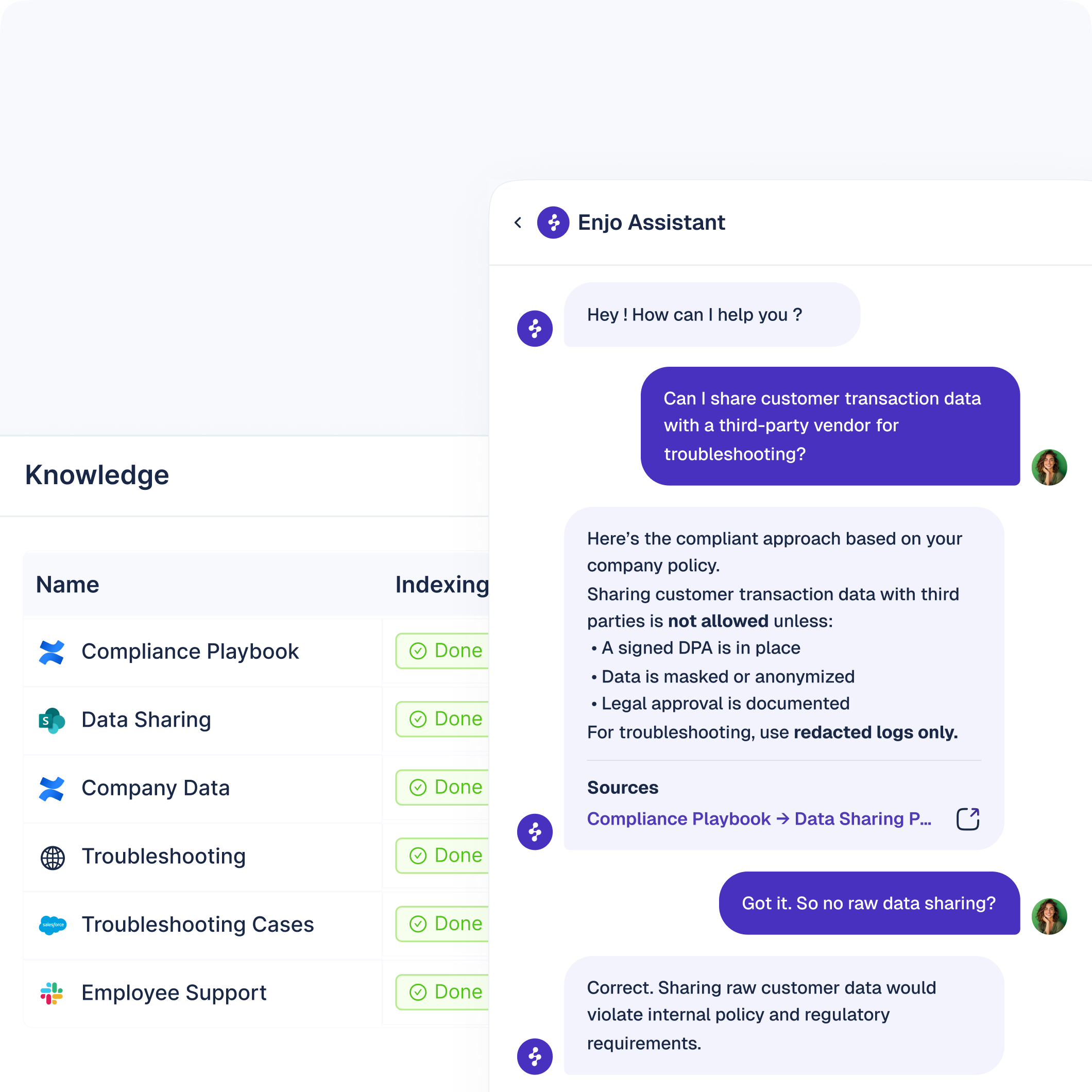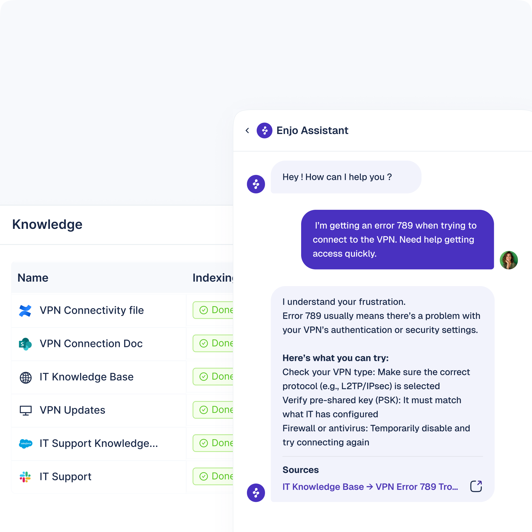 Enjo’s AI-powered knowledge engine retrieves verified company-specific content from compliance playbooks to FAQs in seconds.