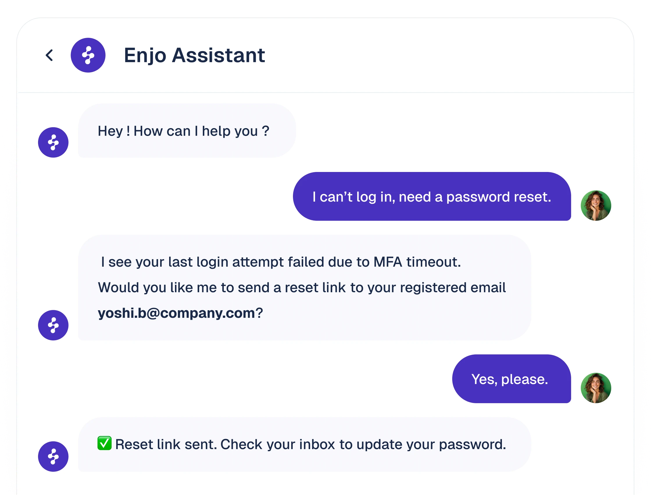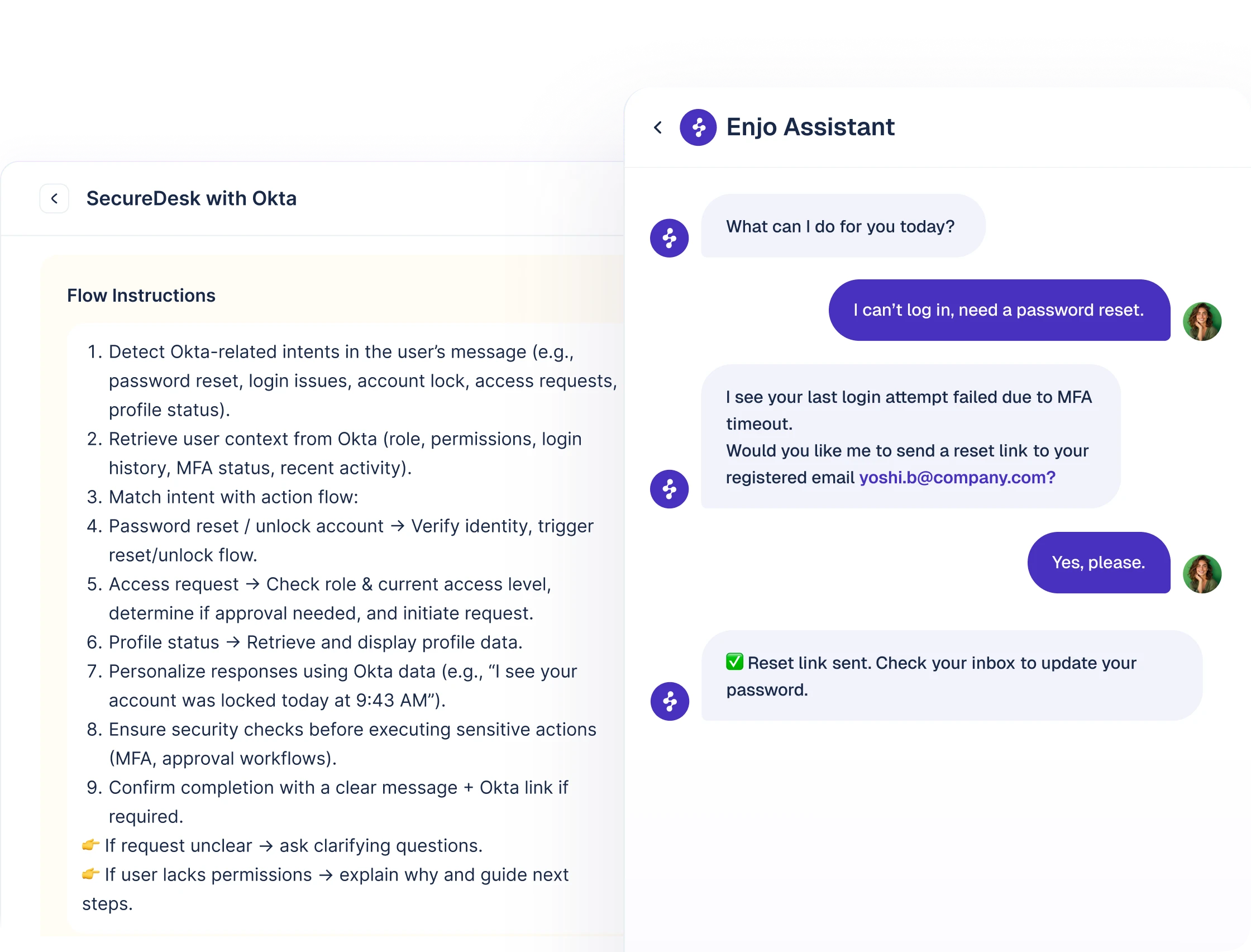 Enjo pulls employee or customer details from Okta in real time, so every support interaction starts with verified identity data.