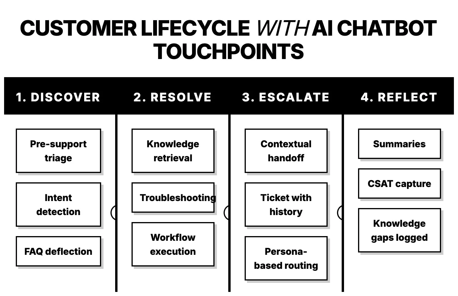 Customer service isn’t a single moment. It spans discovery, problem identification, troubleshooting, escalation, and wrap-up. A website chatbot becomes useful only when it fits into this complete lifecycle.