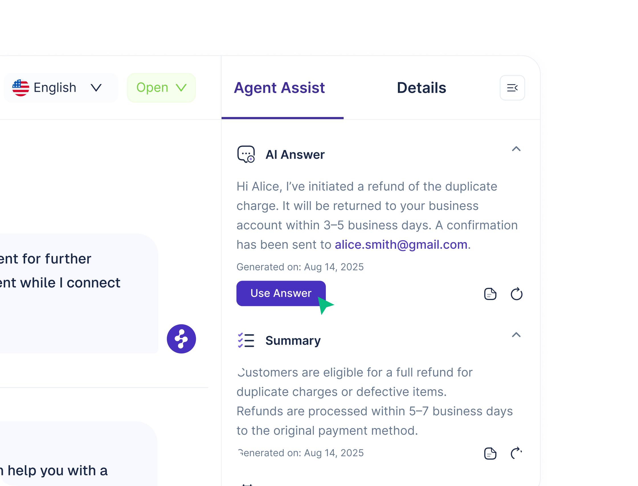 Agent Assist prepares summaries, drafts, and recommendations. Agents stay in control - reviewing, editing, and sending responses, and choosing which actions to run.