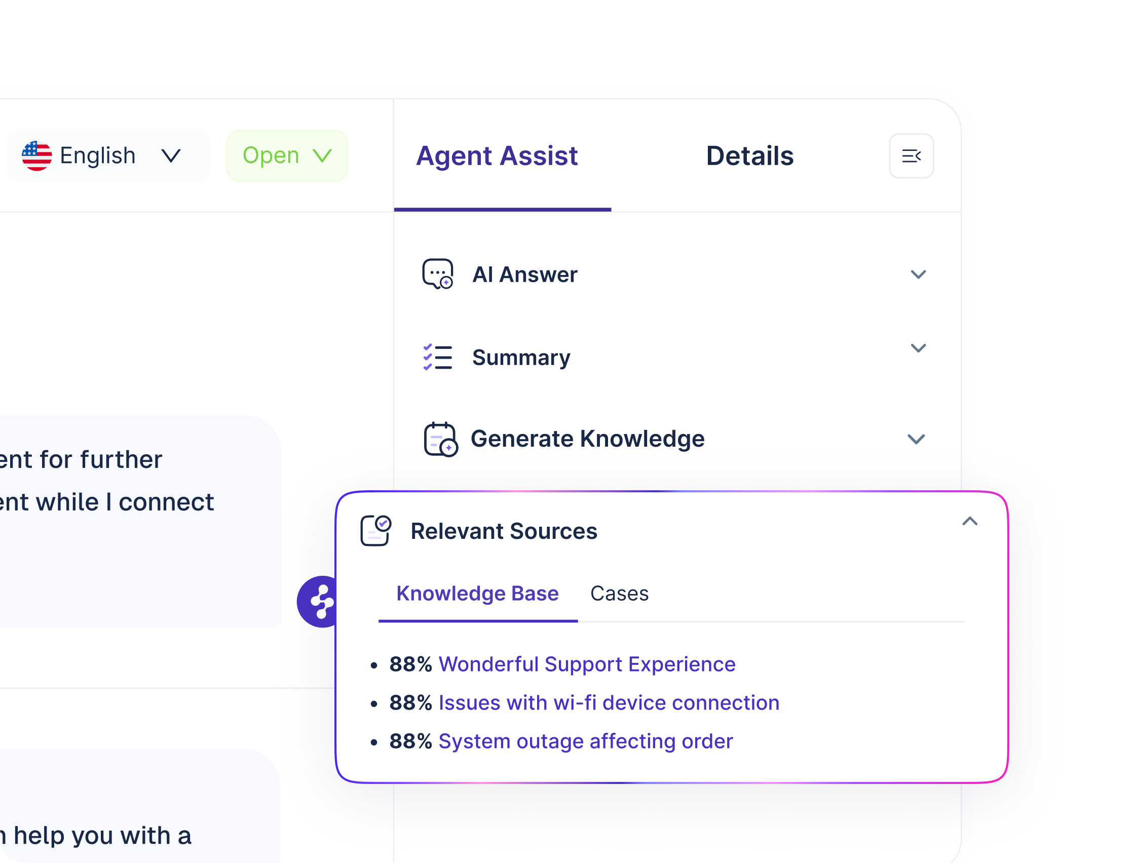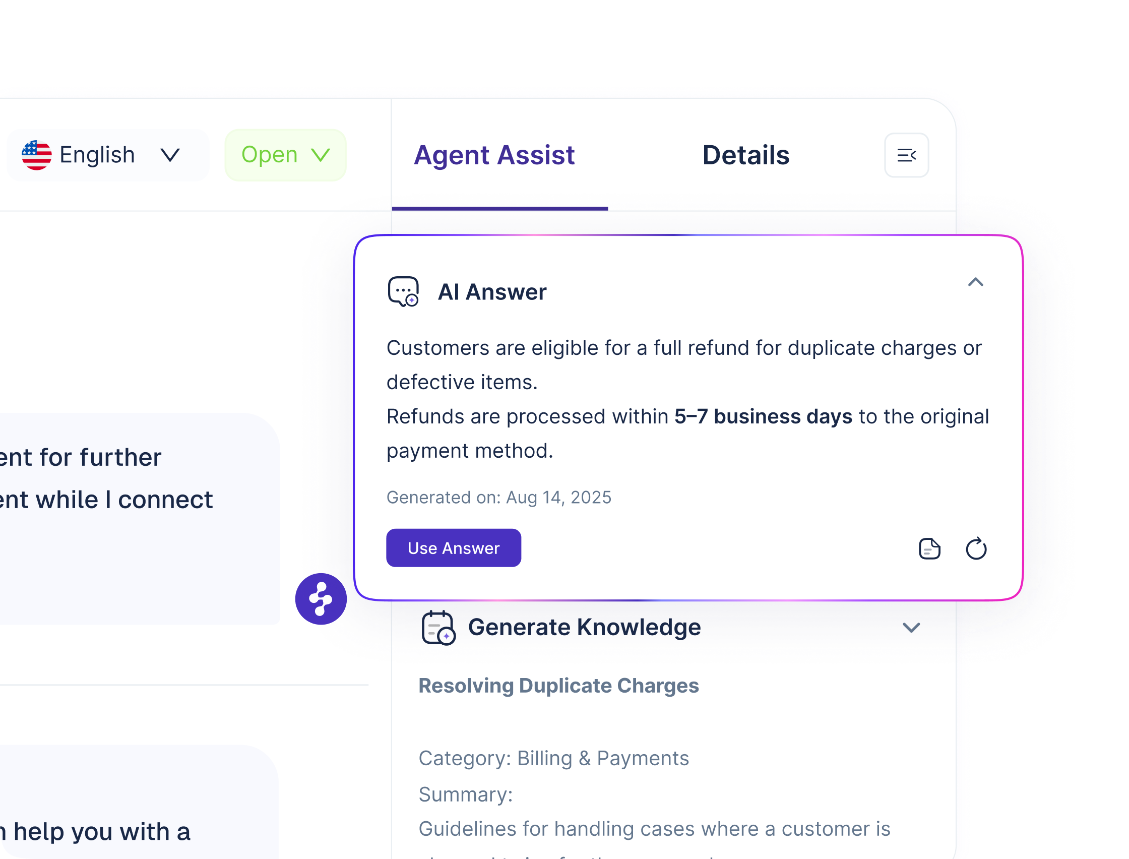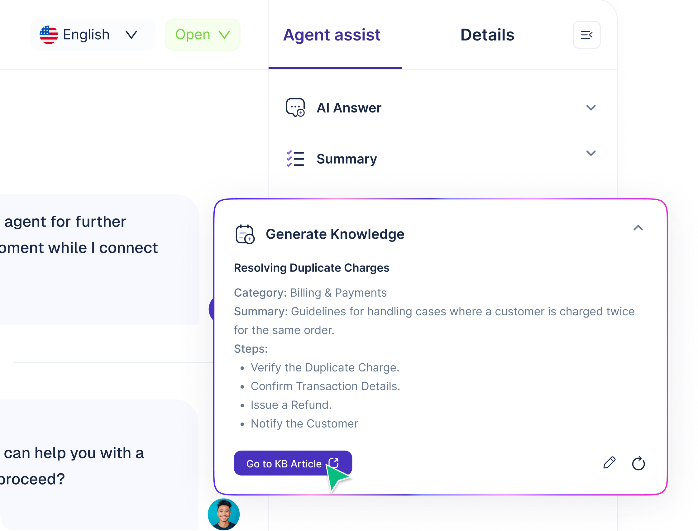 Agents lose time re-reading long threads, searching for the right policy, and rewriting similar responses. That increases handle time, creates inconsistencies, and makes ramping new agents painful. Agent Assist keeps context and knowledge in front of the agent, in the moment, so resolutions happen faster with better consistency.