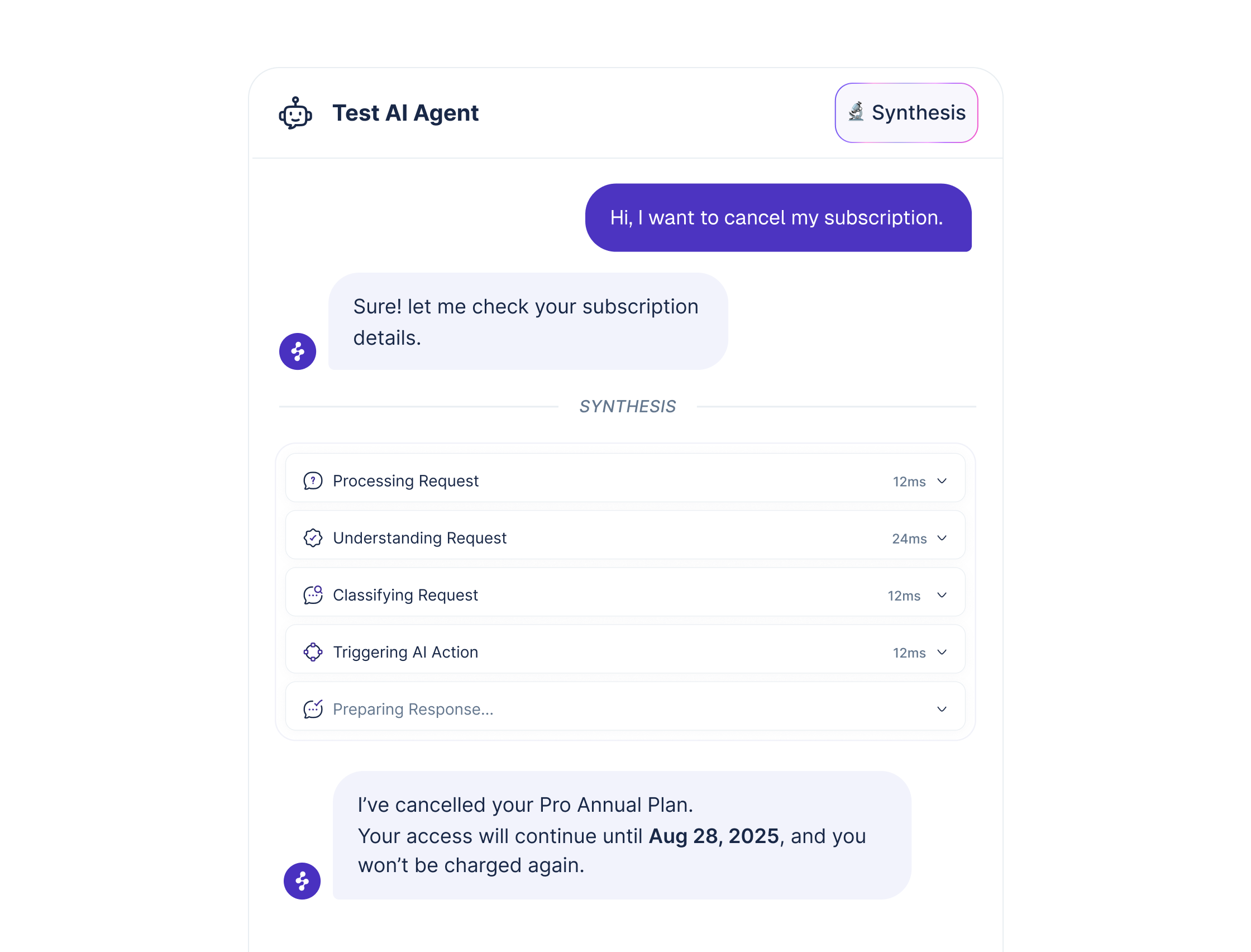 Test a single query and see the trace, lookups, plan, actions, and escalation - so fixes are obvious.