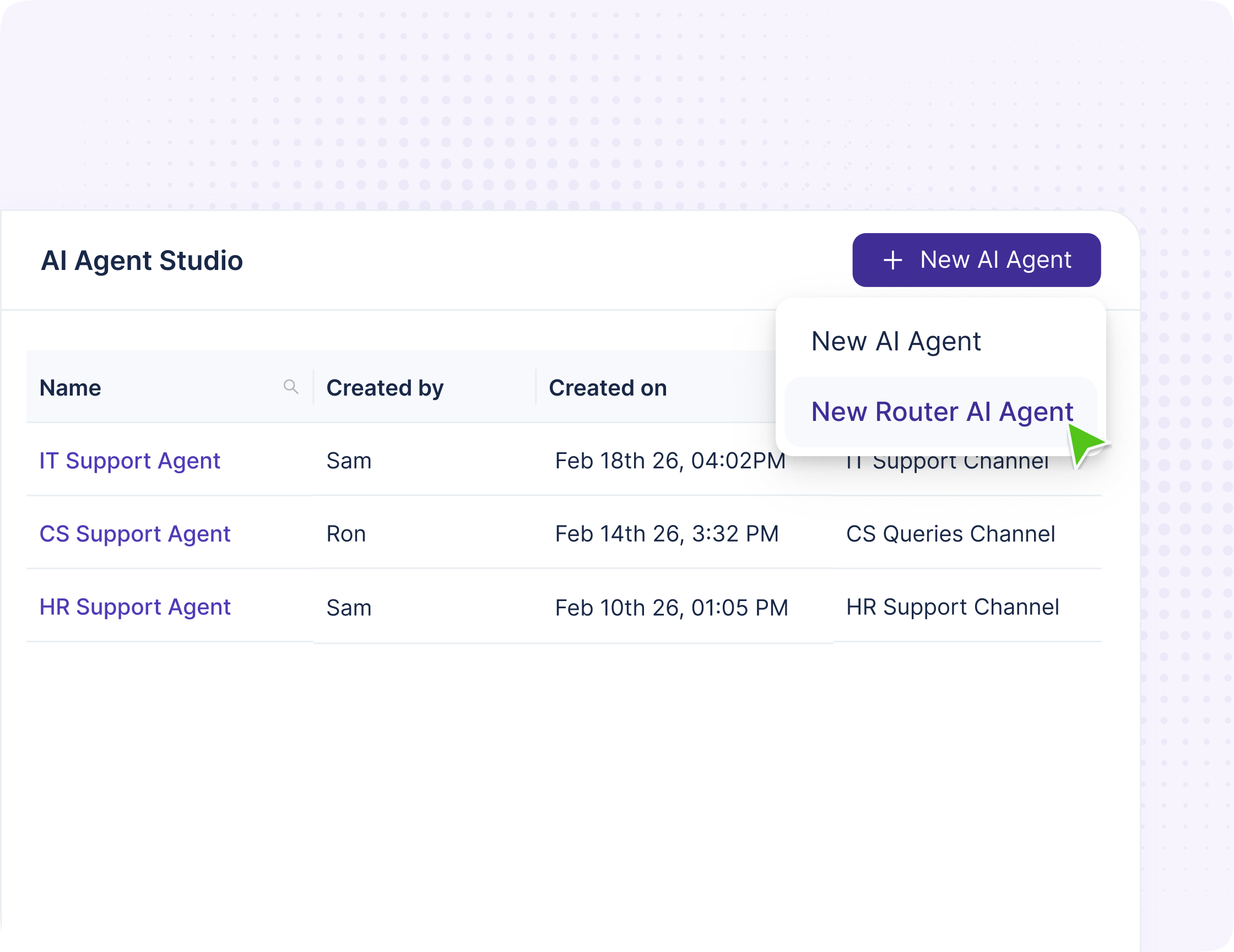 Studio is the no-code AI agent builder inside Enjo. Create standard agents for specific queues or topics, or router agents that route requests to specialized child agents, each ready to answer from trusted knowledge, run actions and AI Flows, create/update tickets, and escalate safely to humans across your channels.