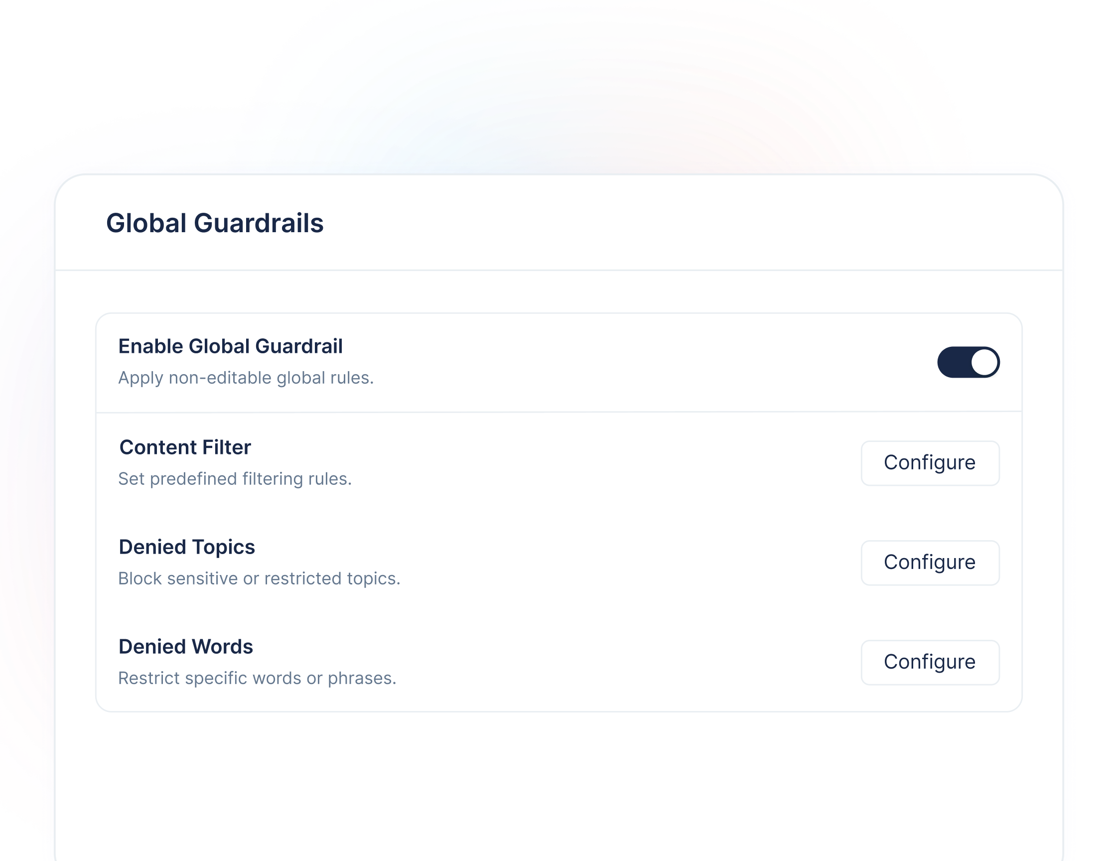 - AI Guardrails for inputs/outputs + full audit logs