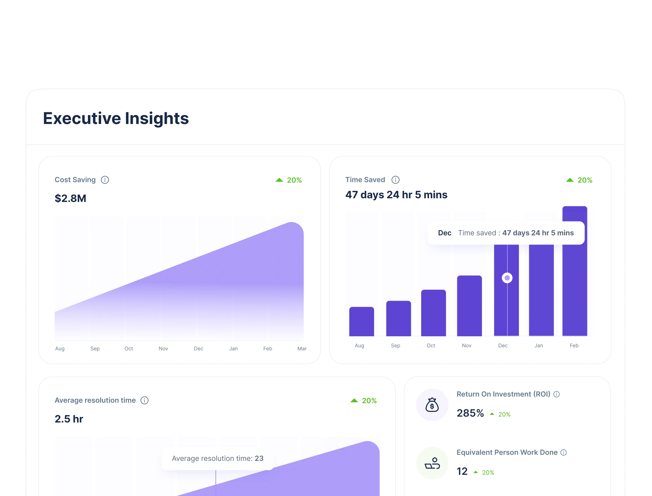 Auto-generate leadership-ready reports on cost savings, efficiency gains, and ROI—no spreadsheet wrestling required.