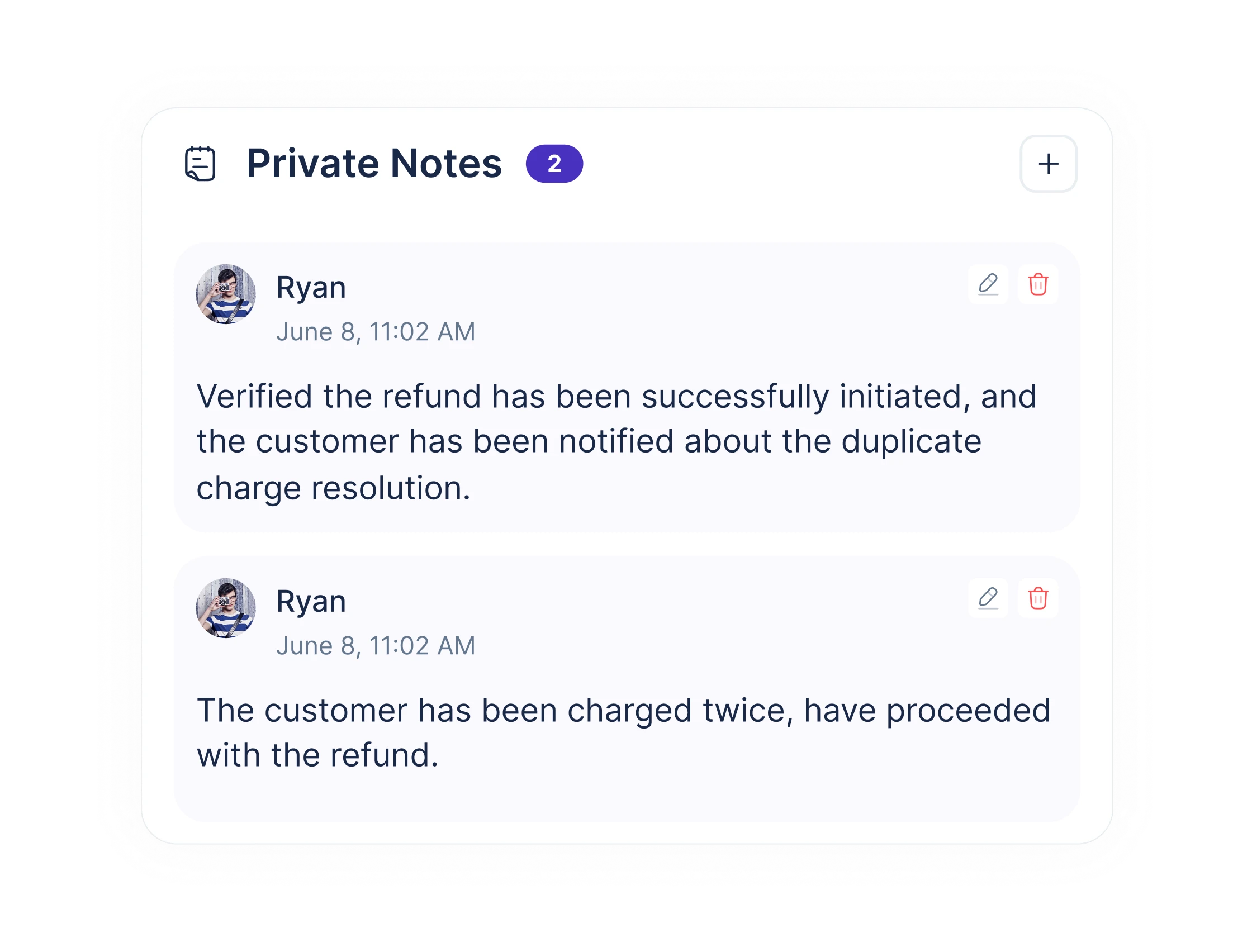 Collaborate on complex issues with private notes and mentions, keeping internal discussions separate from customer replies.