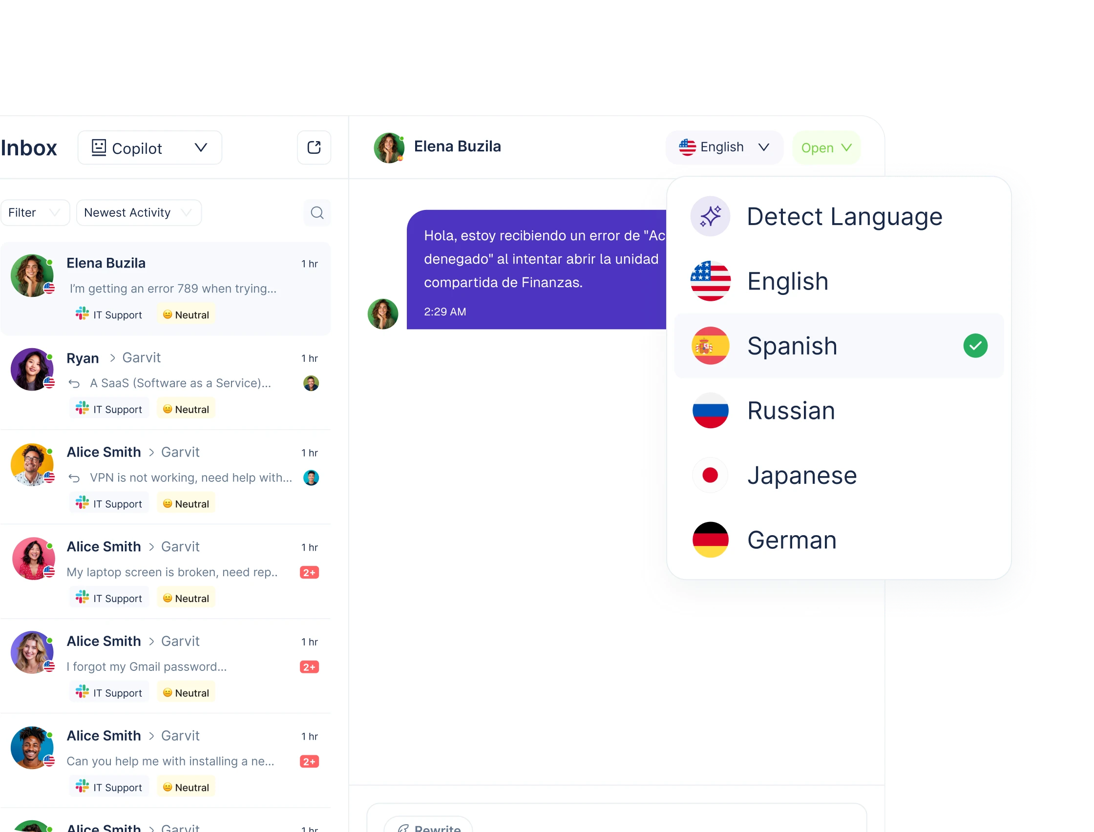 Agents see messages in their language, while customers reply in theirs, ensuring seamless communication without language barriers.