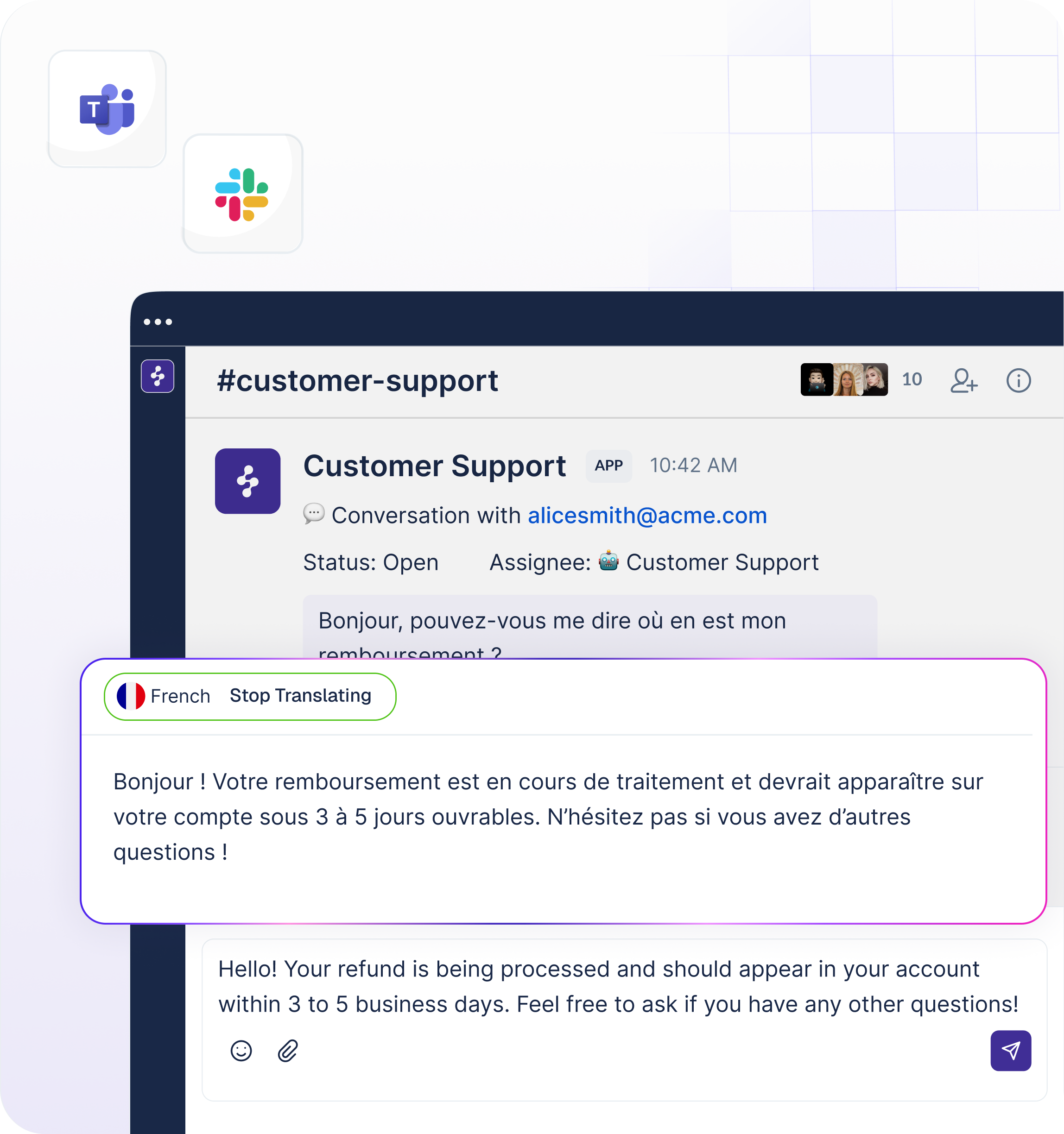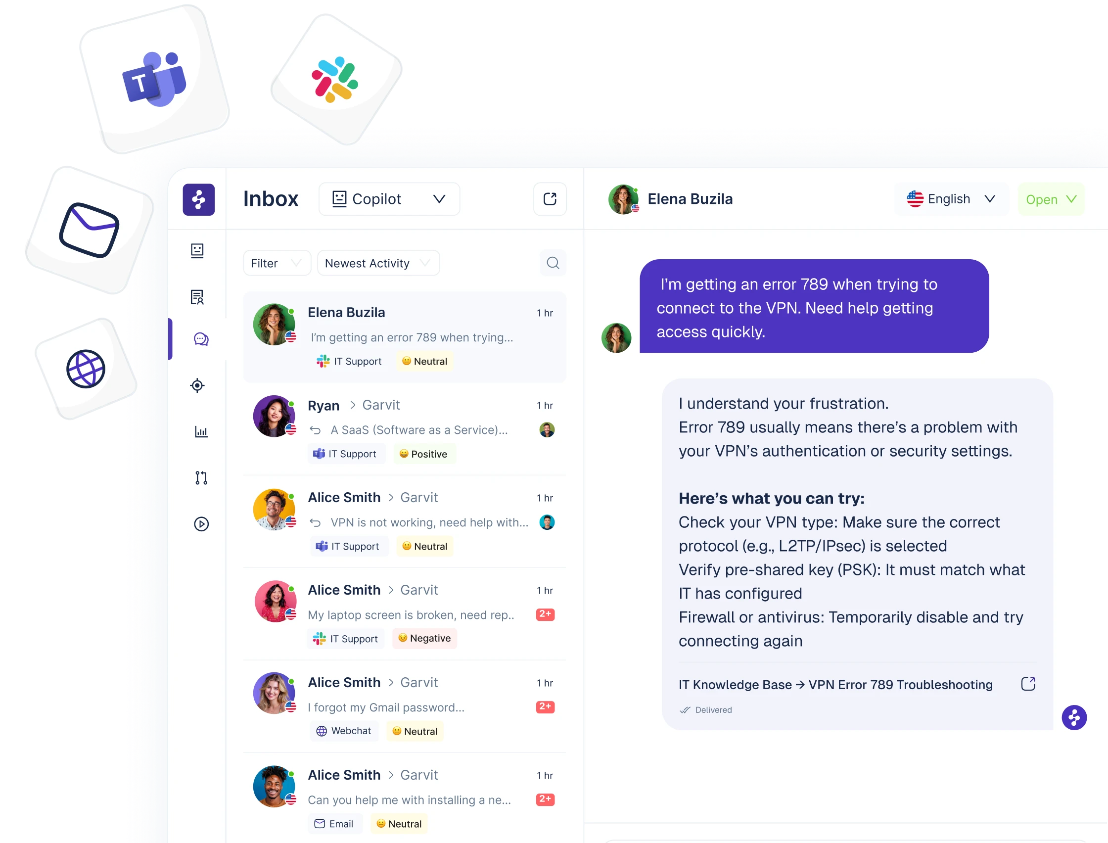 Centralize support from Slack, Teams, and Web in one view, empowered by real-time AI suggestions to resolve escalations faster.