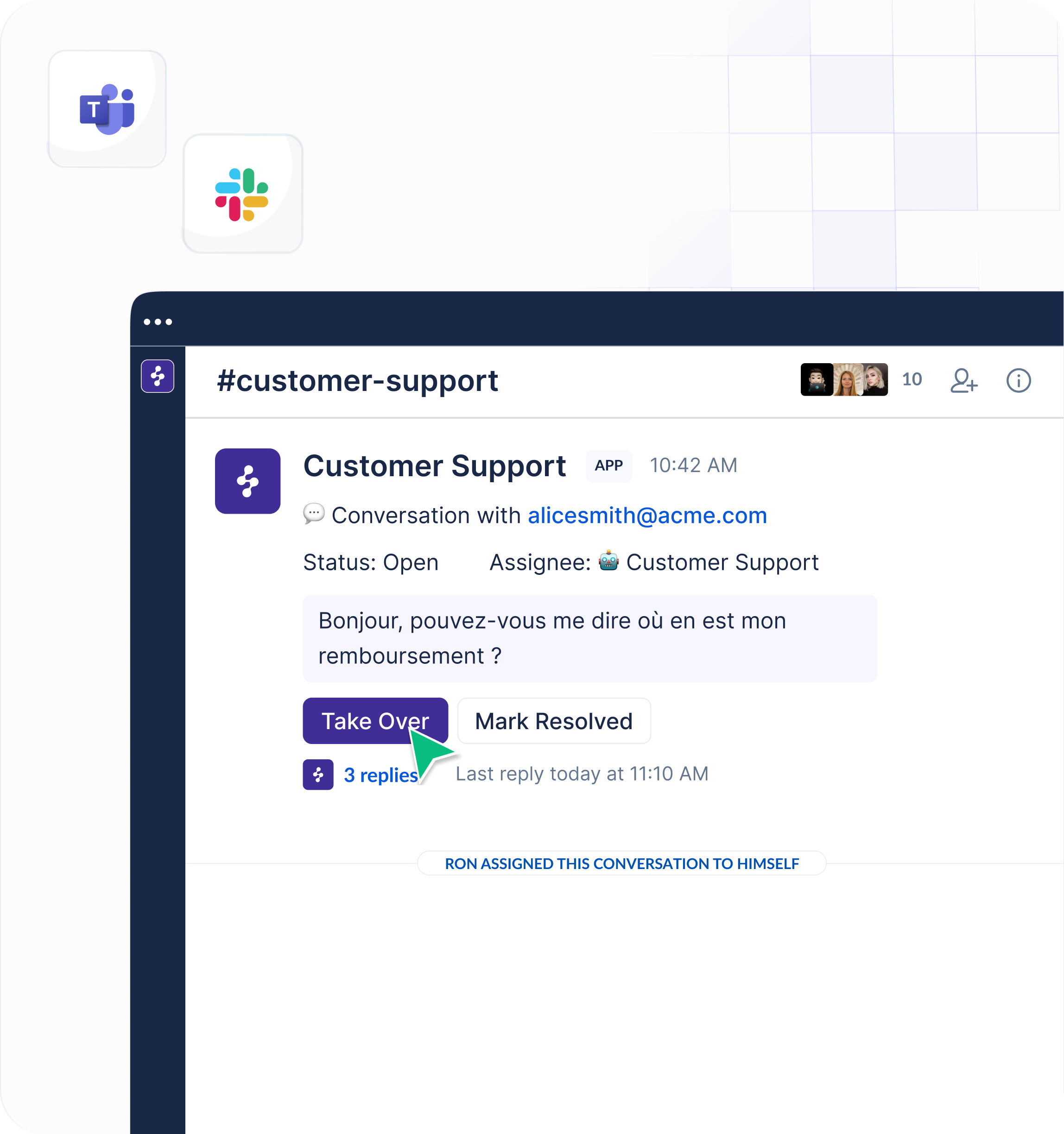 Unify conversations from Slack, Microsoft Teams, Email, and Web Chat into a single, prioritized queue.