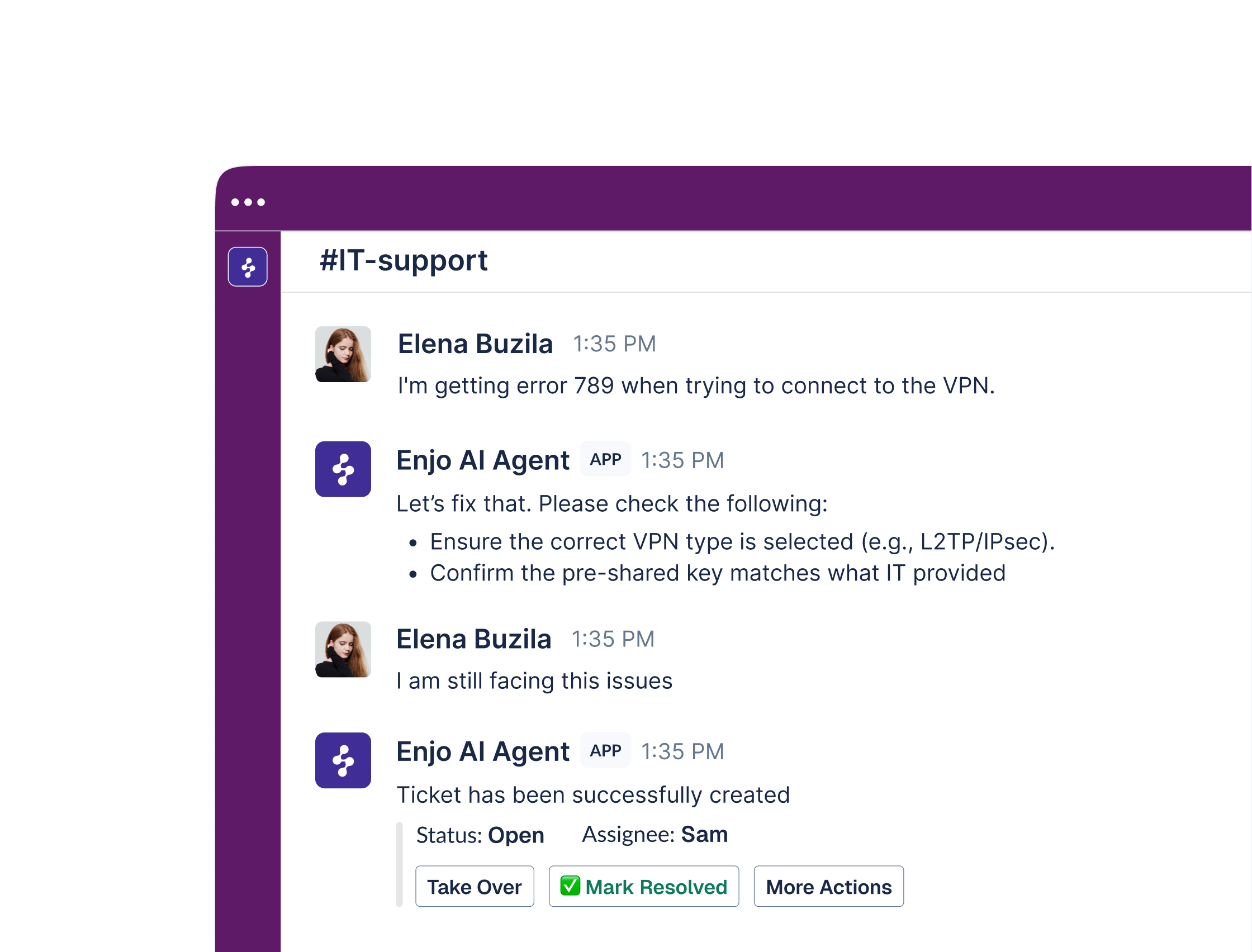 Enjo layers AI-powered help desk capabilities directly into Slack - so your team gets structure without switching tools. Customer requests from shared channels become tracked conversations. AI handles the repetitive stuff. Your agents handle the exceptions.