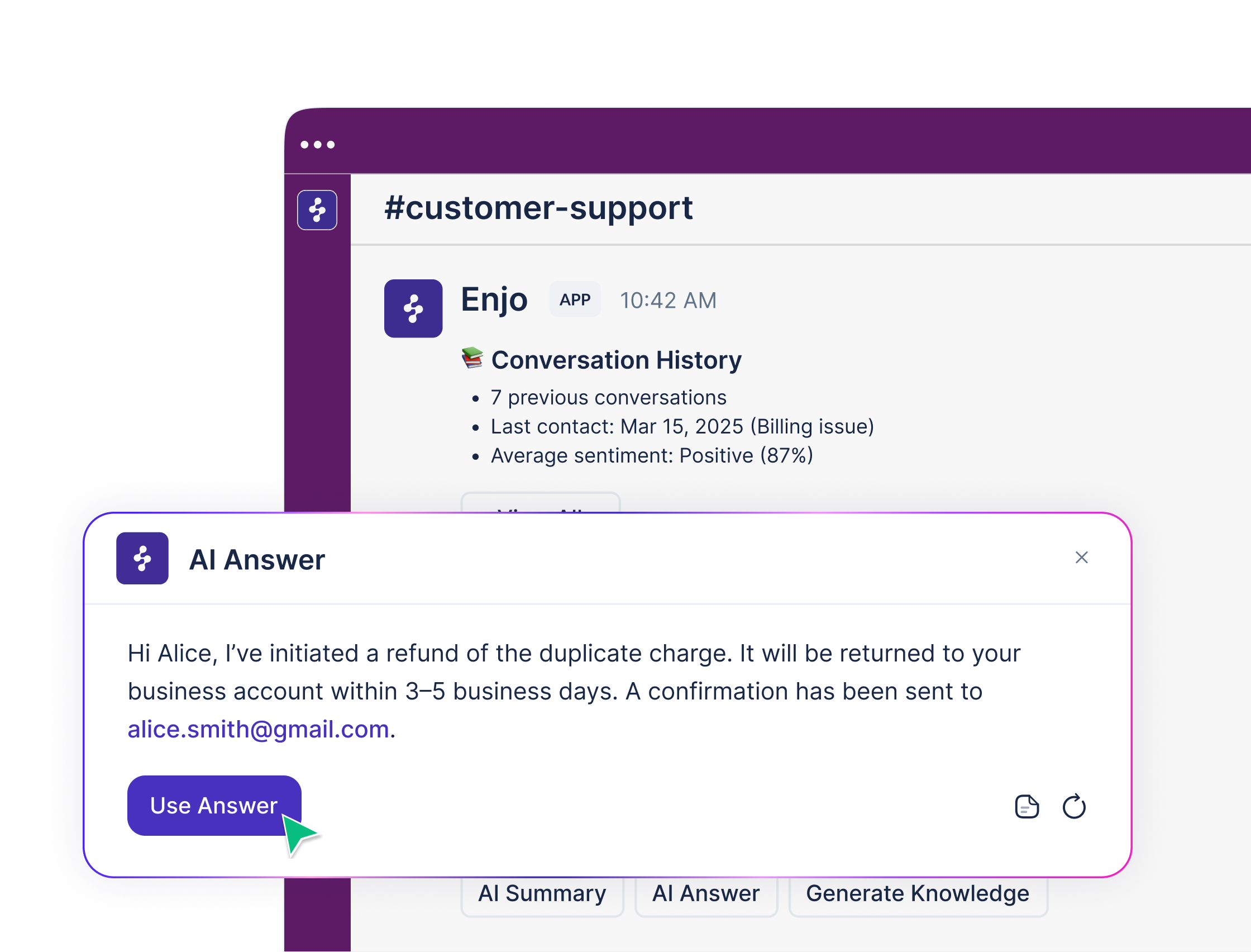 Connect your Slack workspace and Enjo starts working immediately — AI summaries, draft replies, and triage on live conversations from minute one. No training period, no configuration required.