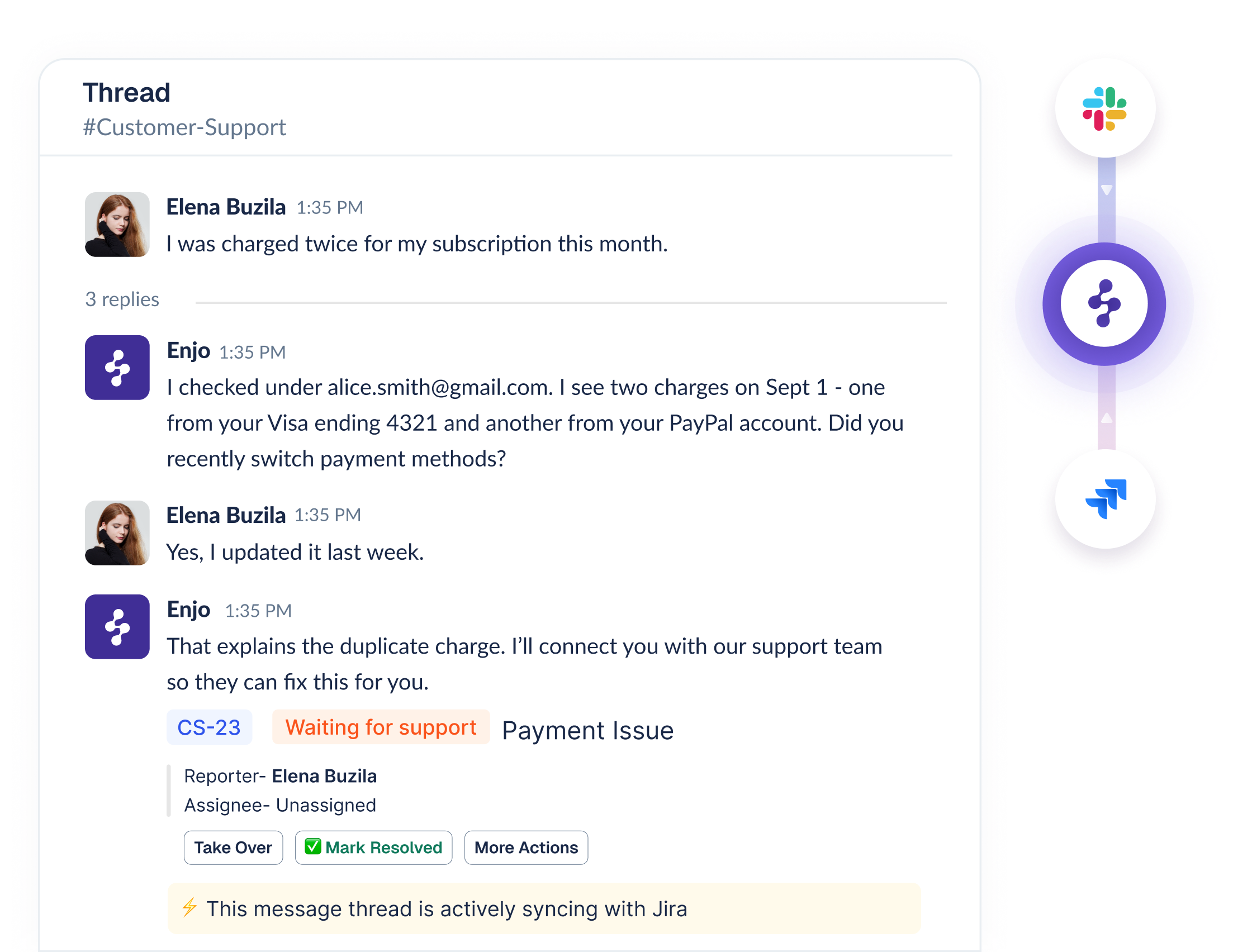 Enjo works standalone or alongside your existing tools. It integrates with Salesforce, Jira, Zendesk, and ServiceNow — so you can start with Slack support and expand from there.