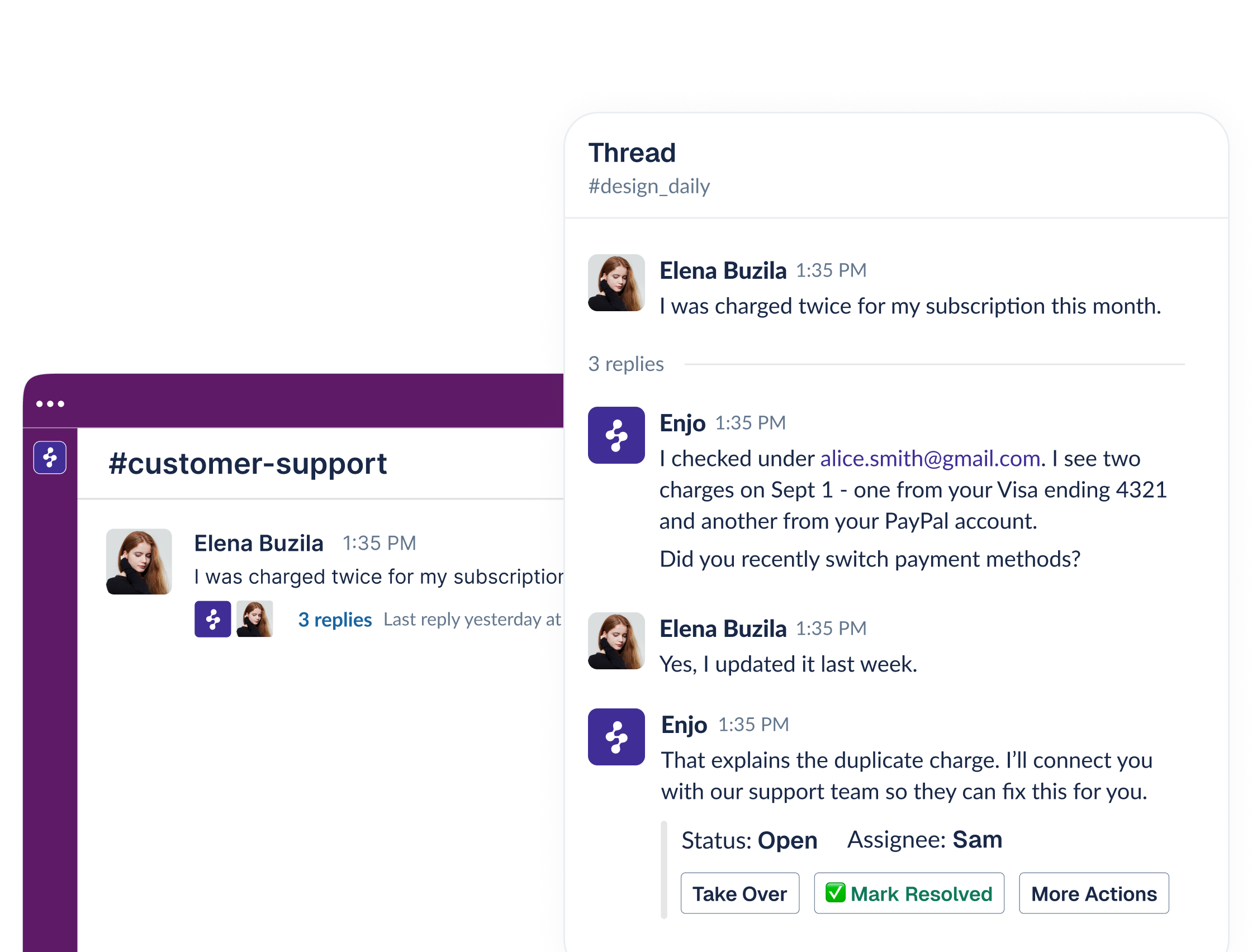 Enjo works where your customers already are - shared Slack channels. Requests become tracked conversations automatically.